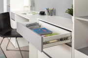 Стильная и актуальная мебель для молодёжной комнаты. Базовый белый цвет, сочетаясь с акцентным серым, создаёт нейтральную основу интерьера, чтобы подчеркнуть личные вещи и аксессуары. Отсутствие лицевой фурнитуры и открывание фасадов за край - не только стилевое, но и функциональное решение. Так мебель занимает меньше места и дает возможность проходить вплотную с фасадом без риска зацепиться за ручку или травмироваться.