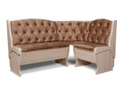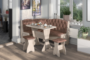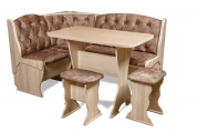 Набор мебели для кухни с классической красивой каретной стяжкой, включающий в себя угловую скамью, стол и два табурета. В угловой скамье под сиденьями расположены два ящика. Каркас выполнен из ЛДСП. Покрытие верхней части столешницы стола - термостойкий пластик, кромка ПВХ – 1 мм. Углы столешницы закруглены для избегания травмирования и придания лучшего эстетического вида.