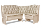 Набор мебели для кухни с классической красивой каретной стяжкой, включающий в себя угловую скамью, стол и два табурета. В угловой скамье под сиденьями расположены два ящика. Каркас выполнен из ЛДСП. Покрытие верхней части столешницы стола - термостойкий пластик, кромка ПВХ – 1 мм. Углы столешницы закруглены для избегания травмирования и придания лучшего эстетического вида.